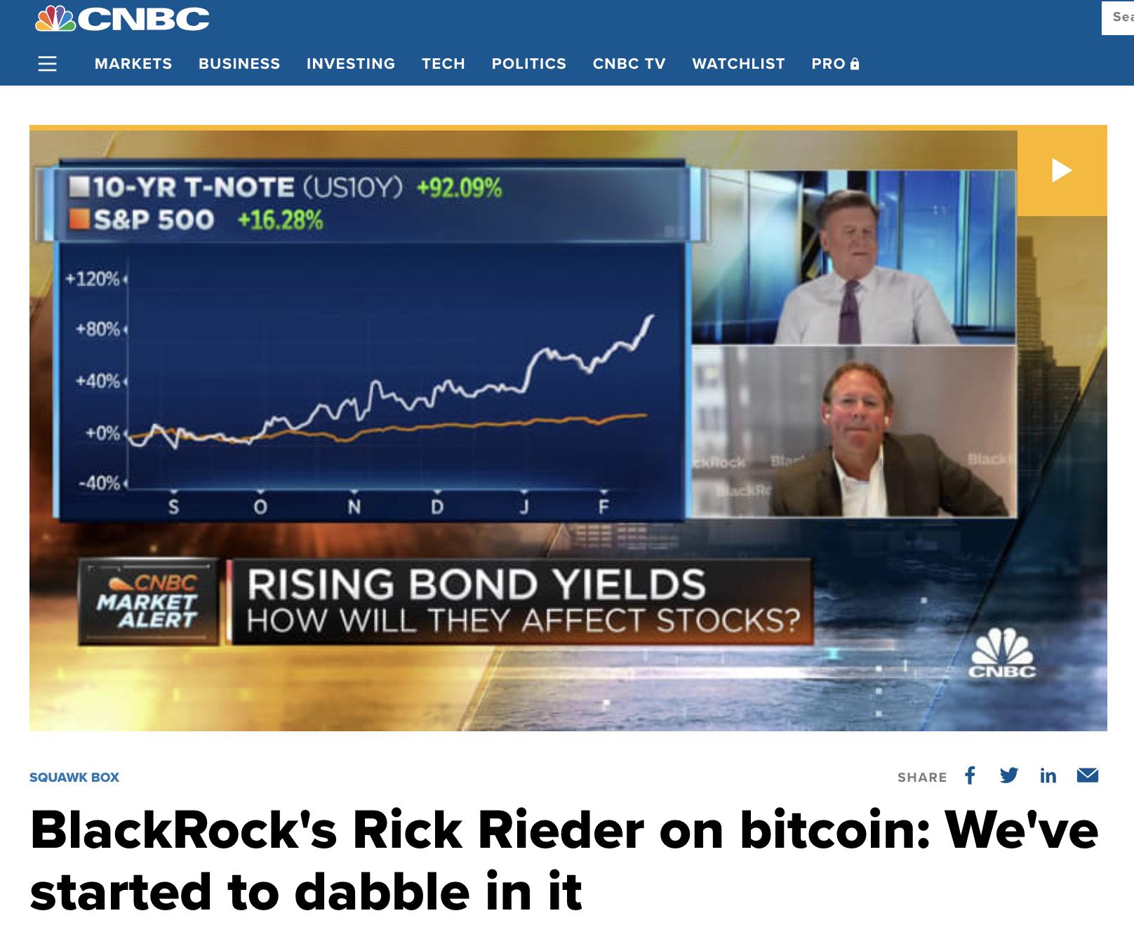 链捕手消息,据CNBC报道,全球资管巨擘贝莱德(BlackRock)固定收益首席投资官 Rick Rieder 表示,“BlackRock 已经开始涉足比特币了。”此前消息,1 月 21 日,贝莱德旗下至少两只基金公司正在关注加密货币领域,且该公司已批准至少两只基金可投资比特币期货产品。