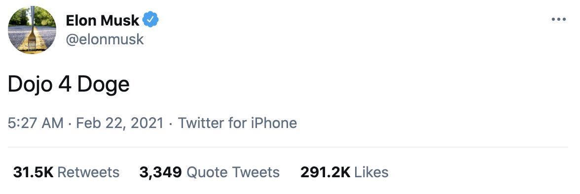 链捕手消息,特斯拉CEO埃隆·马斯克再次发布狗狗币相关推文:“Dojo 4 Doge.” 根据Reddit中的讨论,这条推文与特斯拉超级计算机Dojo有关,Dojo预计将在2021年底问世。该超级计算机将帮助特斯拉从汽车摄像头和道路上收集数据。