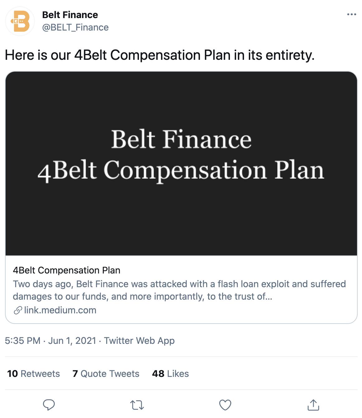 3)与其他协议团队谈判,将他们收到的部分资金归还给用户。Belt将在北京时间6 月 2 日 15:00 开放提款。