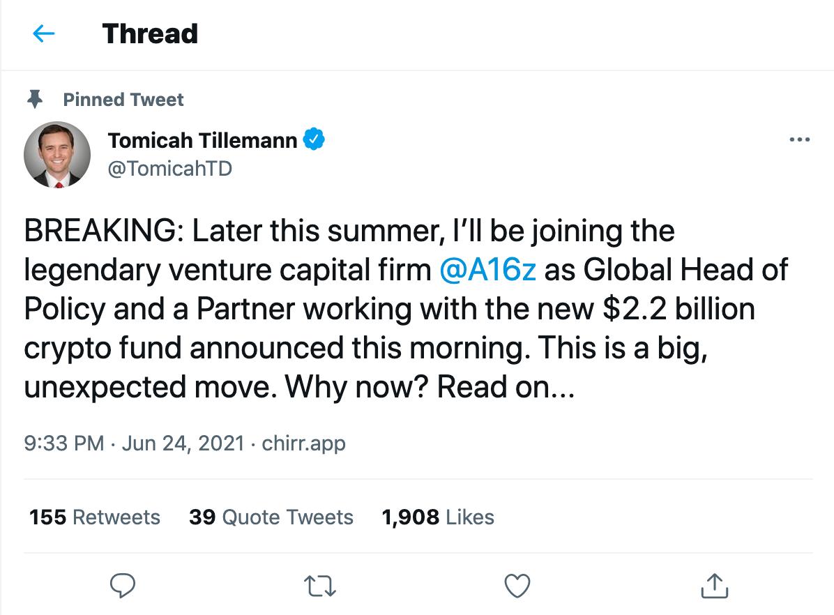 ZEC $322.81 -2.93%链捕手消息,美国前国务卿高级顾问Tomicah Tillemann今日在推特宣布,即将加入风险投资机构A16z任全球政策主管,并担任A16z新推出的加密货币基金的合伙人。