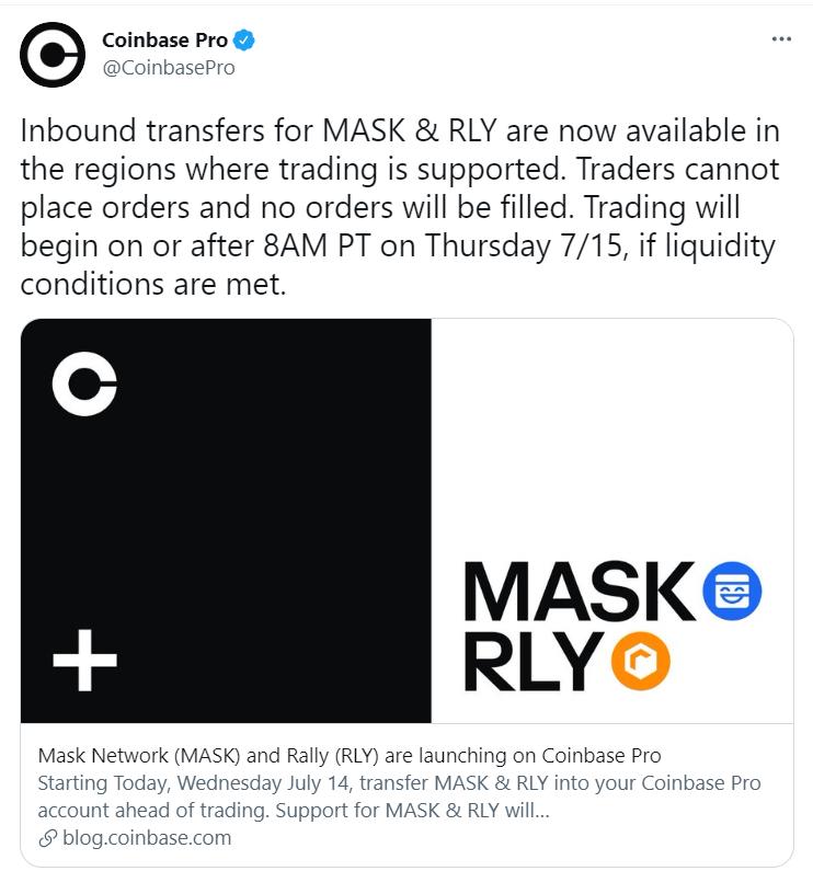 链捕手消息,Coinbase Pro宣布将上线Mask Network (MASK)和Rally (RLY)。目前已支持充值转账,如果满足流动性条件,交易将在北京时间7月15日23点或之后开始。