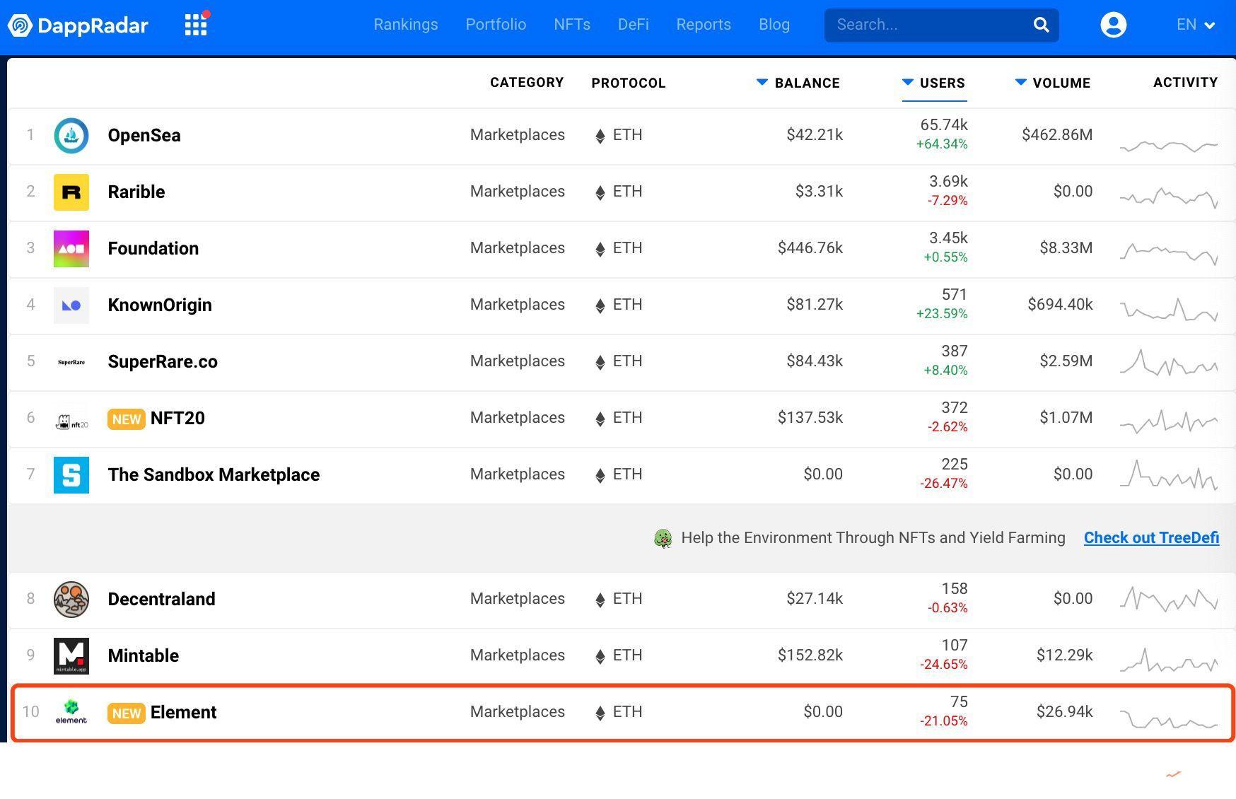 Element上线一周登上DappRader排名前十