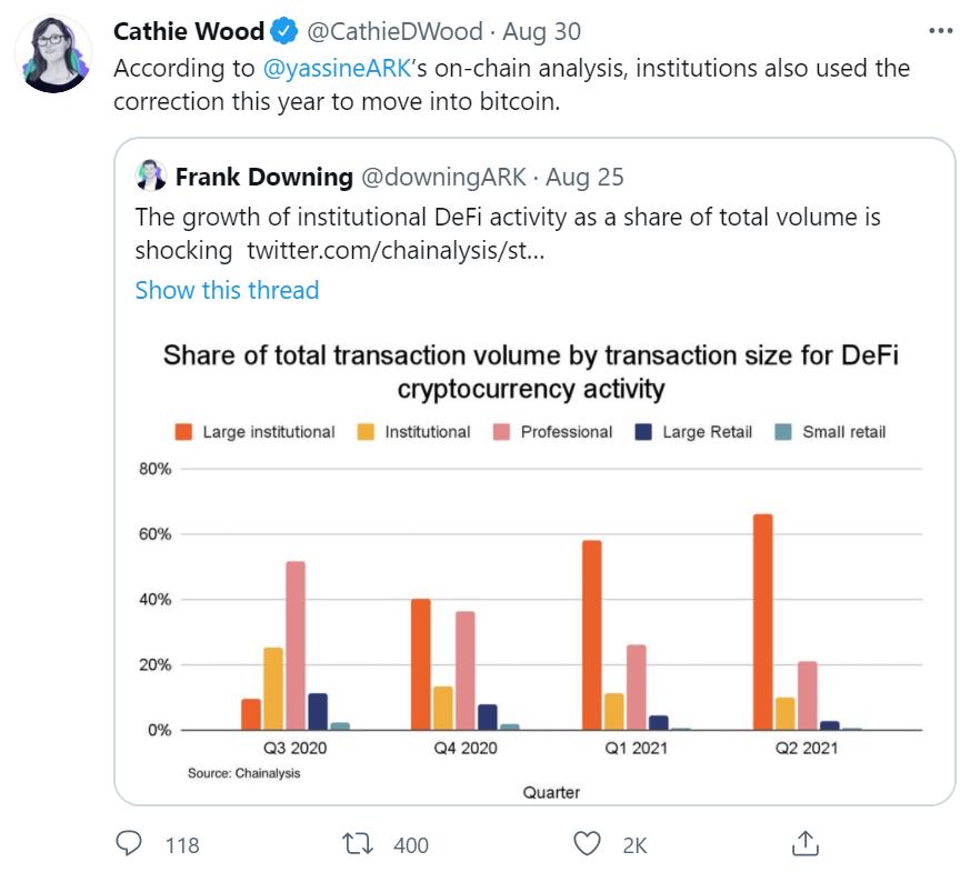 链捕手消息,方舟资本创始人Cathie Wood推特转发方舟加密分析师Yassine Elmandjra的推文称:“从链上分析看,机构也已利用今年的回调买入了比特币。”根据分析师分享的报告,2021年二季度,大型机构交易或超过1000万美元的交易已占DeFi交易的60%以上,2020年三季度时该比例还不到20%。