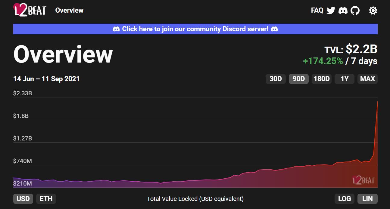 链捕手消息,L2BEAT数据显示,截至9月12日,以太坊Layer2上总锁仓量22亿美元。其中锁仓量最高的为扩容方案Arbitrum,约15亿美元,占比65.68%。其次是dYdX,锁仓量超3.26亿美元,占比14.58%。