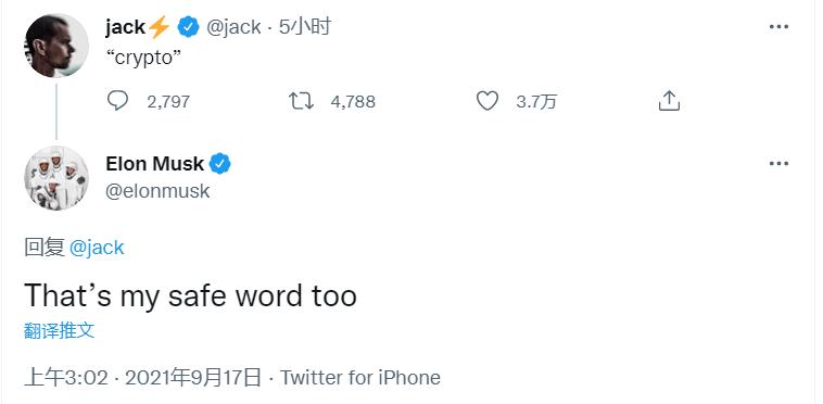 马斯克回应推特创始人:crypto是我的“安全词”