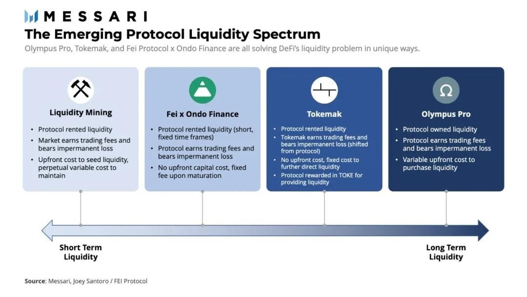 下面的图表概述了主要的 LaaS 提供商及其流动性频谱的相对位置。一方面是传统的流动性挖掘,由于其上述风险,被认为是最短期限(和最高成本)的流动性形式。Fei Protocol 最近与 Ondo Finance 的合作推出了一个 LaaS 平台,用于产生短期流动性,基本上可以按需打开或关闭。