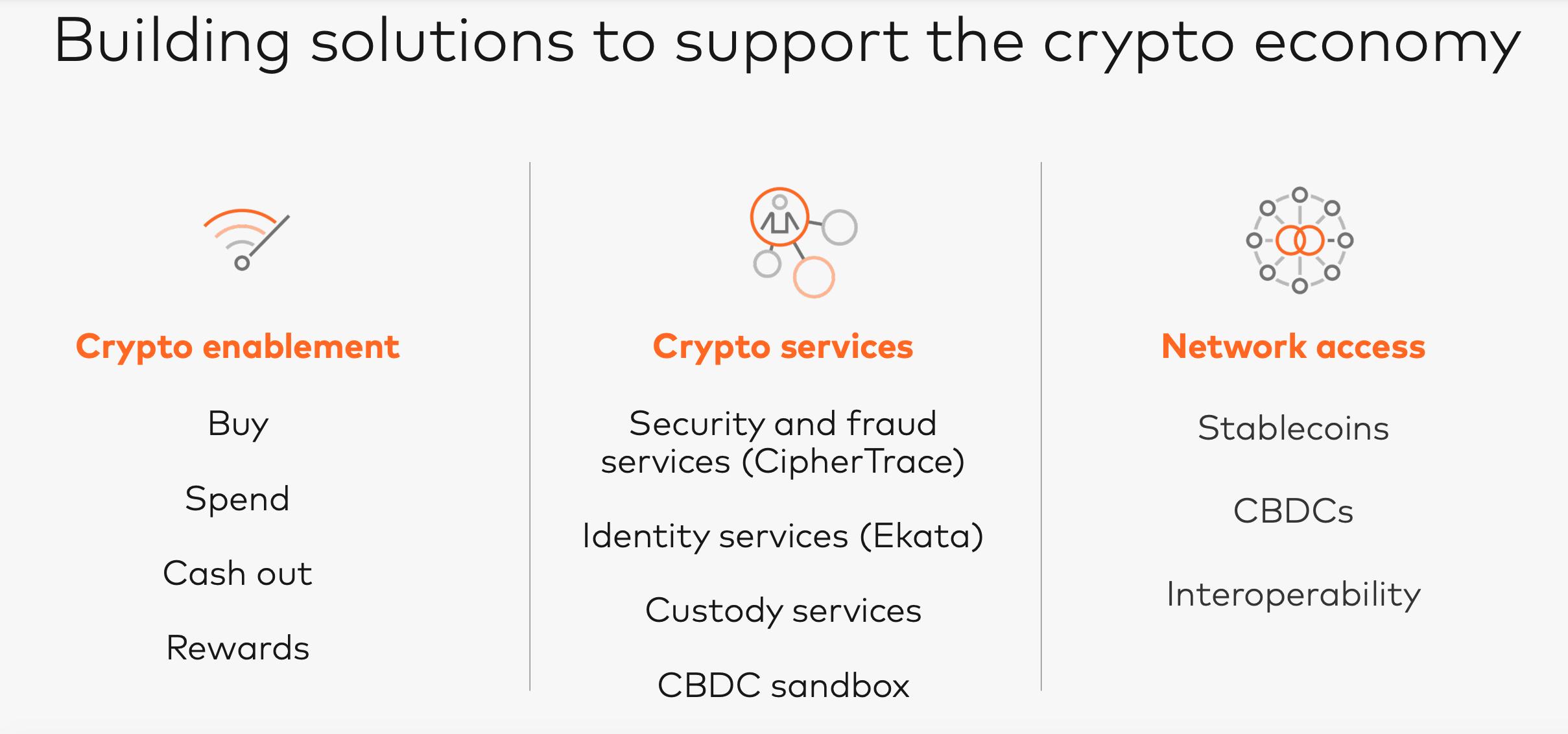 链捕手消息,万事达卡在其投资社区会议中公布的资料显示,其已制定了支持加密货币社区发展的三项战略:加密货币的购买、支出、兑现和奖励;加密安全,包括身份服务;网络访问,包括互操作性、稳定币和 CBDC。(来源链接