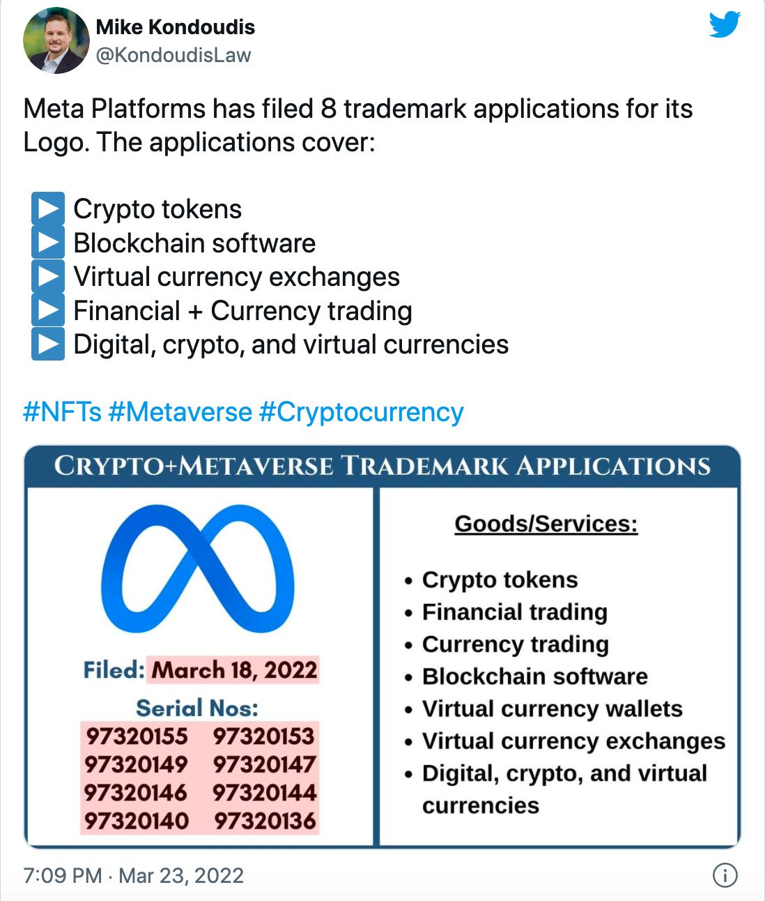 “这些文件反映了该公司进军元宇宙的战略,Meta 显然对虚拟经济有重要的计划来推动它,”商标律师 Mike Kondoudis表示。(来源链接)