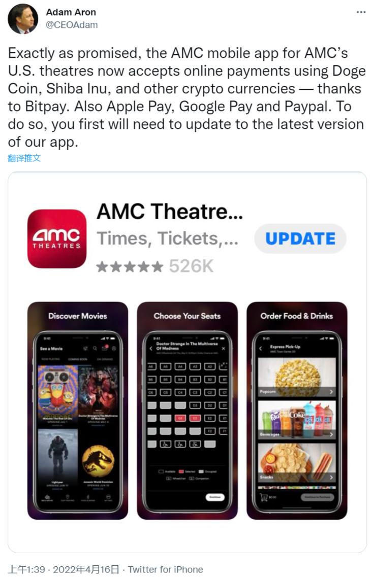 此前1月份报道,美国影院巨头AMC首席执行官Adam Aron在推特上宣布,“很可能”在今年3月增加对狗狗币(DOGE)和Shiba Inu(SHIB)的支持。