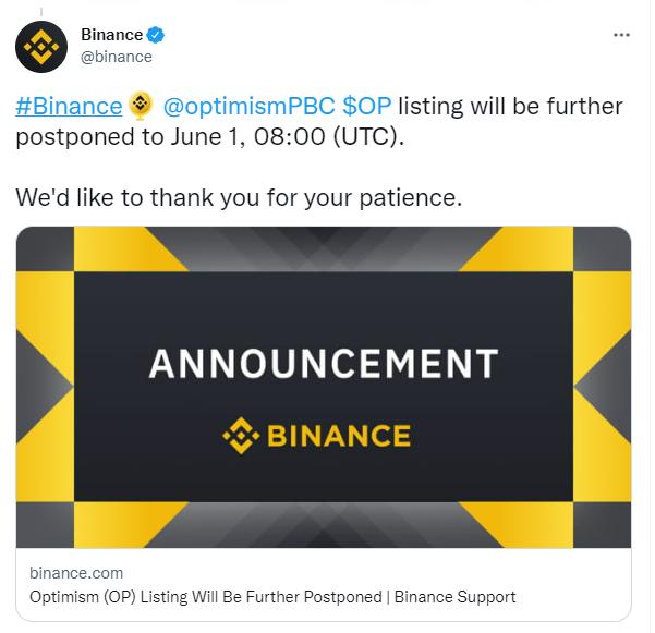 链捕手消息,币安官方发推表示将 Optimism 代币 OP 现货交易时间进一步推迟至 6 月 1 日 16:00,请用户耐心等待。