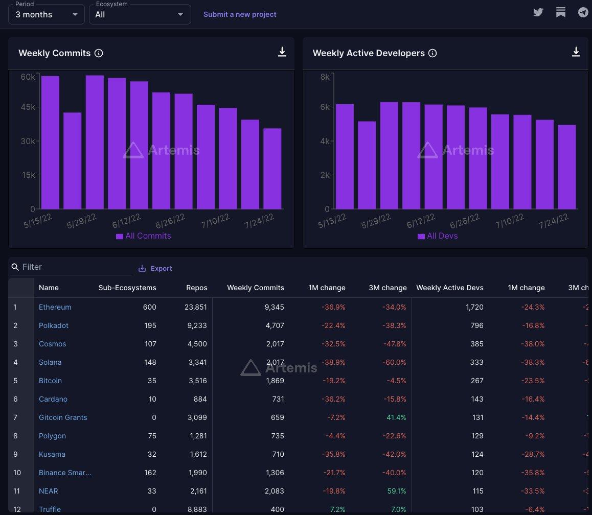 链捕手消息,推特用户 @Tisoga 援引 GitHub 数据表示,过去三个月 Web3 生态的每周活跃开发者维持在 5000 名左右,其中以太坊以 1720 名位居榜首,占比约 34.4%,其次分别为 Polkadot(796 名)、Cosmos(358 名)、Solana(333 名)、比特币(267 名)等。