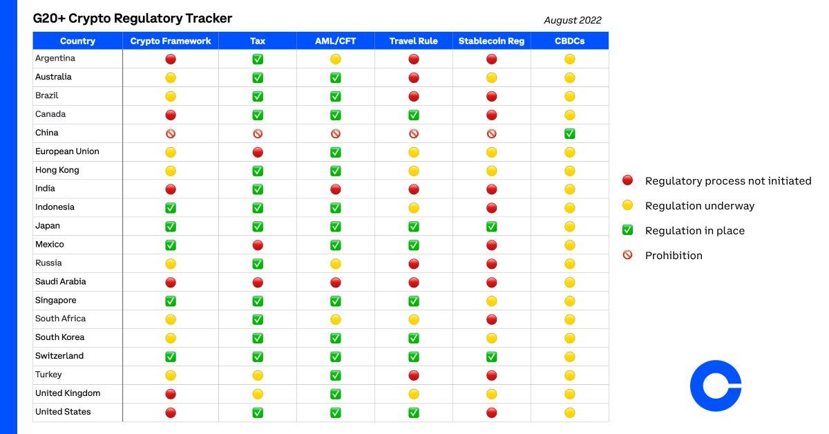 链捕手消息,Coinbase CEO Brian Armstrong 在推特上表示:虽然没有被广泛报道,但在过去一年中,G20 在加密监管明确性方面取得了重大进展。与一年前相比,下图的绿色部分和黄色部分要多得多。新兴的共识将推动加密货币更大的采用。
