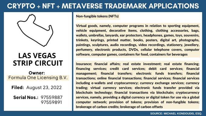 链捕手消息,据美国律师注册商标律师 Mike Kondoudis 的推文,世界一级方程式锦标赛(Formula One)已为拉斯维加斯大道巡回赛(LAS VEGAS STRIP CIRCUIT)提交两项 NFT、加密货币及元宇宙相关商标申请,范围涵盖NFT、加密货币、虚拟服装+运动设备、货币交易+虚拟货币服务等。