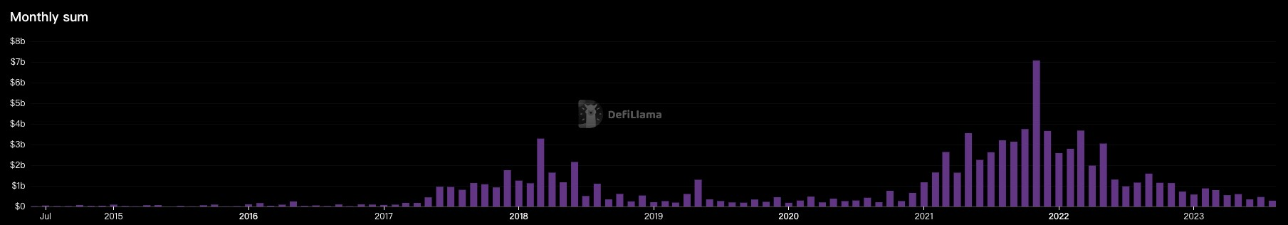 场内资金不足,山寨币去泡沫。除去BTC和ETH的加密货币总市值已接近6月底部区间,山寨币整体持续失血,呈现出阴跌的走势。XRP完全抹去了SEC官司胜诉带来的涨幅,ARB则是跌破了6月的低点,仅有部分小市值山寨币在做市商的参与下出现Pump & Dump行情。曾经的链上明星项目UNIBOT、BITCOIN、OX的下跌幅度更大,表明市场资金和信心都不足。