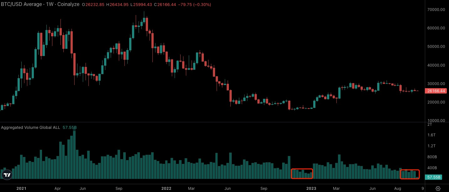 图:BTC交投寡淡,成交量接近FTX暴雷后的水平