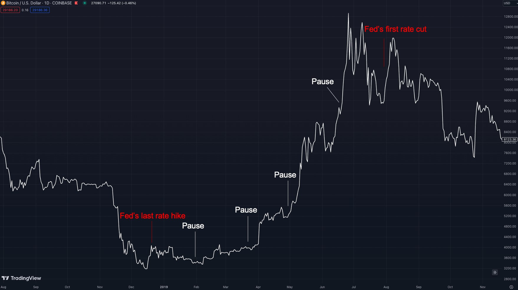 图:2019年,美联储暂停加息后,BTC迎来一轮大幅上涨