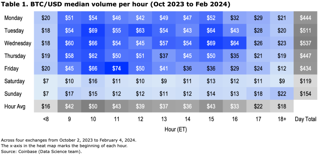 这与我们在四个平台上比特币交易量的盘中热图一致(见表1)。这表明,在过去四个月中,大多数交易活动都发生在美国工作日,且集中在美国东部时间上午 9 点至 11 点和下午 3 点至 4 点之间,是其他时间段的 2-3 倍。