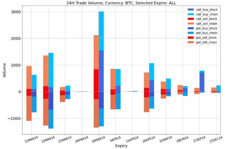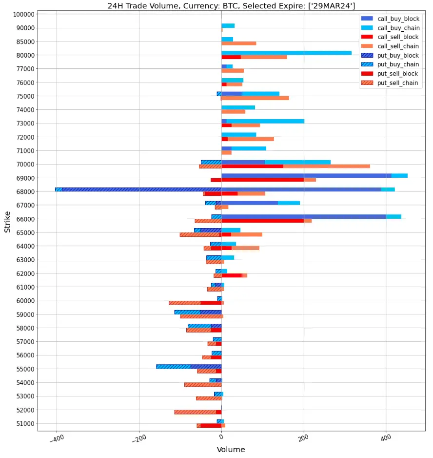数字货币在 FOMC 过后持续走强,从 62000 美元支撑位处反弹来到 67000 下方,连日来紧张的情绪有所释放,期权中前端隐含波动率显著走陡回落,倾斜的波动率曲面也终于发生扭转,ETH 三月底强劲的看涨期权买入将 25 d RR 推回到零值附近,BTC 三月底也同样出现了看涨期权的多头建仓,同时还有 387.5 组 68000 的 Long Straddle 以 73% Vol 成交,押注季度交割前的波动。