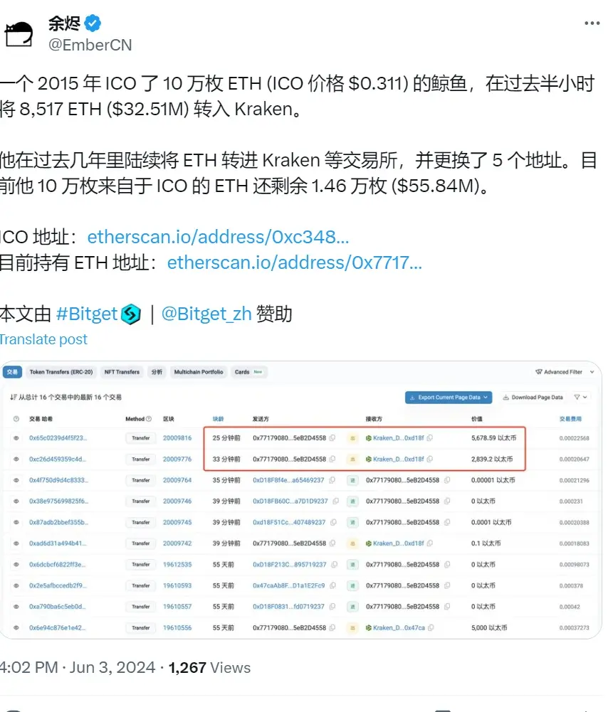 ChainCatcher 消息,据 @EmberCN 监测,一个 2015 年 ICO 了 10 万枚 ETH (ICO 价格 0.311 美元) 的鲸鱼,在过去半小时将 8,517 ETH (约合 3251 万美元) 转入 Kraken。