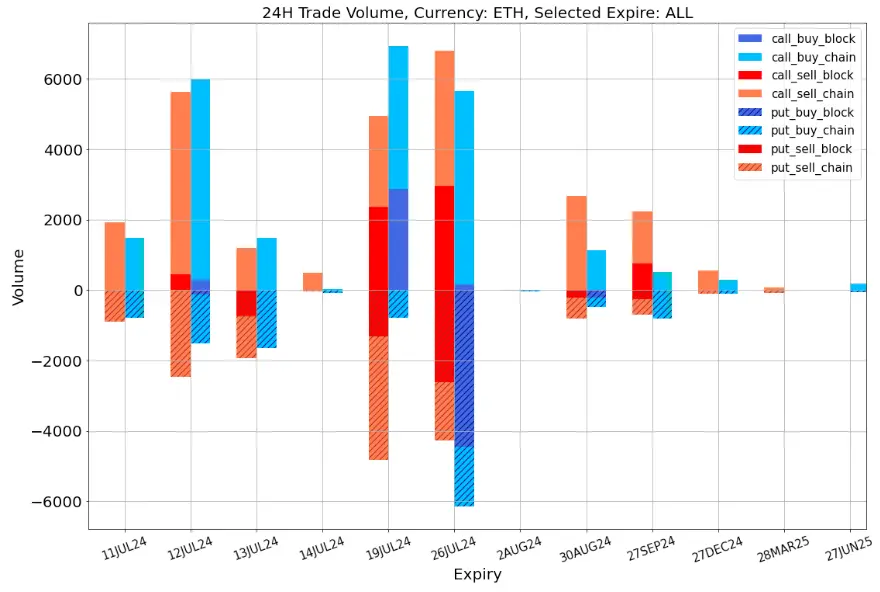 从交易上看,近期成交的一个特点是 P/C Ratio 明显增高了,基本维持在 1: 1 左右,就像今天 ETH 19 JU L2 4 上大量 Put 被卖出, 26 JU L2 4 上 Sell Put Spread 也成为市场关注焦点,解释了 ETH 前端 Vol Skew 的回归。BTC 则同时有 Sell Call Spread 和 Sell Put Spread 出现,相对谨慎地看跌短期内的波动。