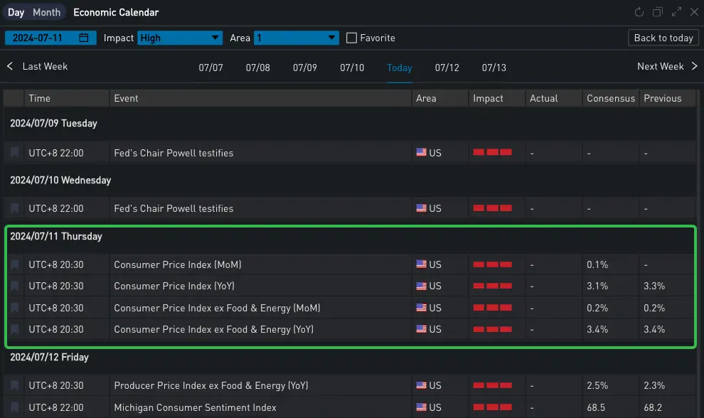 周二美联储主席鲍威尔发表讲话,肯定了美联储在过去通过冷却劳动力市场来降低通胀作出的努力和成效,表示劳动力市场不再是造成通胀的原因,但另一方面,听众能感觉到他这次整体措辞都比较严谨,并没有在政策方向上给出明显的指引,从市场的反应来看,过去两天里标普和纳斯达克都跃跃欲试屡创新高,美债收益率小幅震荡,或是在等待今晚 CPI 数据的指示,如果能数据符合预期(3.1% ),那一定程度上可以印证通胀确实在朝着美联储目标的 2% 迈进,也能为其在九月降息提供支撑。