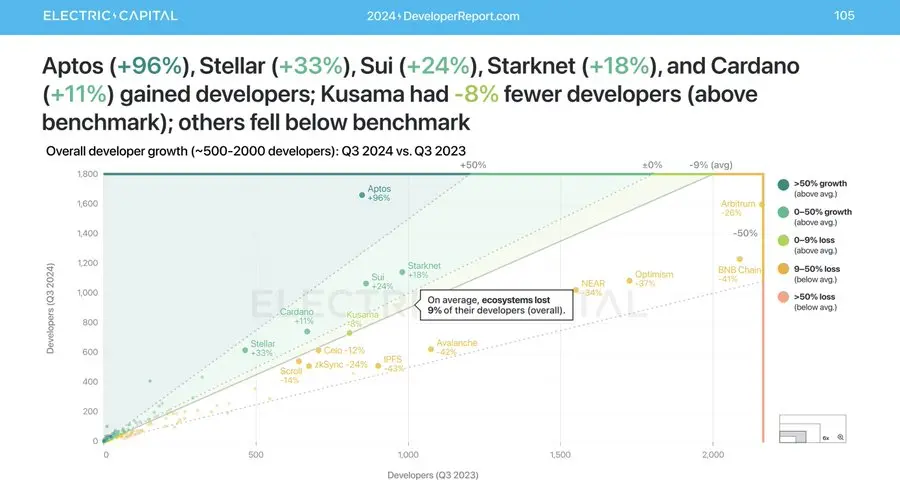 数据:Aptos 在同行中开发者增长率为 96%,位列第一
