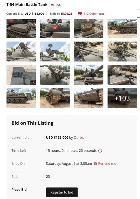 ChainCatcher 消息,据公开拍卖信息显示,Ourbit 以 15.5 万美元出价参与竞拍一辆 T-54 主战坦克,目前拍卖仍在进行中。最终竞拍结果将于 8 月 9 日揭晓。