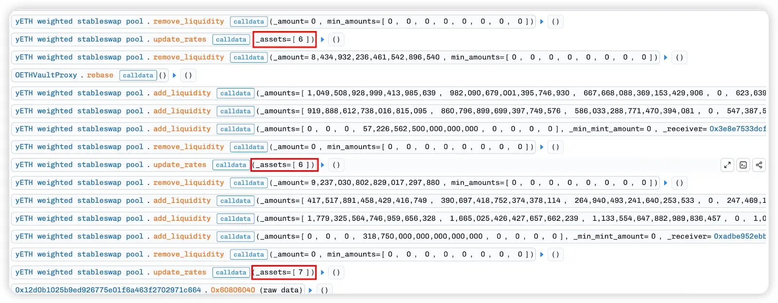 - Immediately after, a massive amount of rETH tokens was injected into the single-sided pool, followed by the key step of remove_liquidity, but with _amount=0.