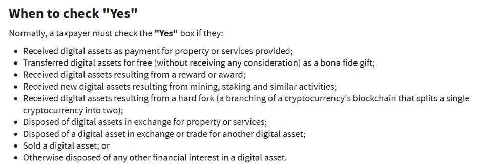 このリストには、受け取る、稼ぐ、移転する、または暗号通貨を販売して通貨利益を得るなど、必ず「はい」を選択しなければならない9つの例が示されています。唯一「いいえ」を選択できるのは、納税者が暗号資産を単に保有している場合、彼らのウォレット間で資産を移転する場合、または法定通貨で暗号通貨を購入する場合です。(Cointelegraph)