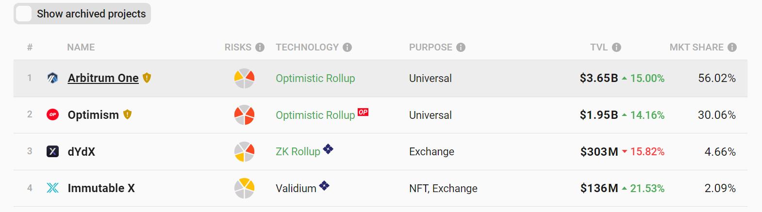 ChainCatcher のメッセージによると、Layer2 データプラットフォーム L2Beat の表示では、Arbitrum チェーン上の TVL は 365 億ドルに増加し、Layer2 トラックの市場シェアは 56% です。第2位は Optimism で、TVL は 195 億ドル、市場シェアは 30% です。(出典リンク)