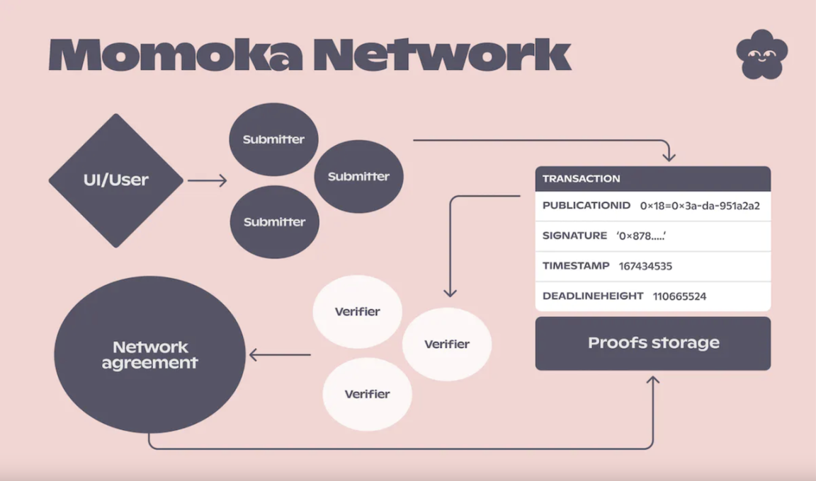 Momokaネットワークには、主に2つの役割がある。提出者(Submitters)と検証者(Verifiers)である。前者は取引データを検証し、Arweaveにデータを提出する役割を担い、現在はLens公式が指定したホワイトリストアドレスが担当している。後者は提出者が提出したデータの有効性を監視し、確認を行う役割を担い、誰でもMomokaノード検証者(Verifiers)を使用して取引を証明し、検証できる。