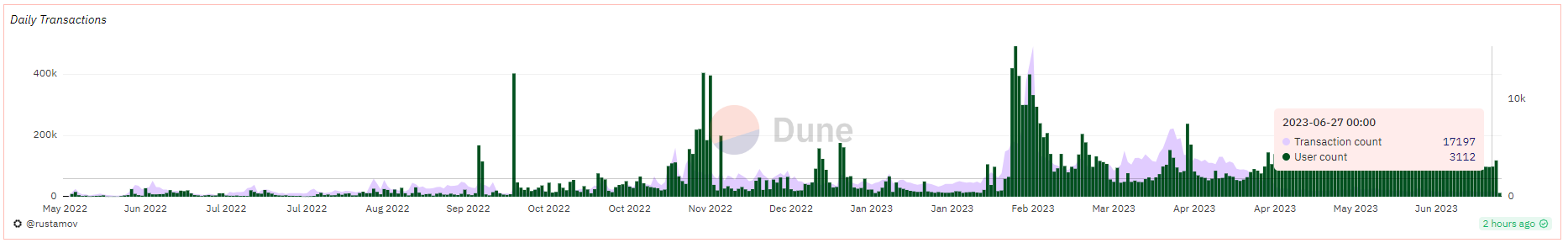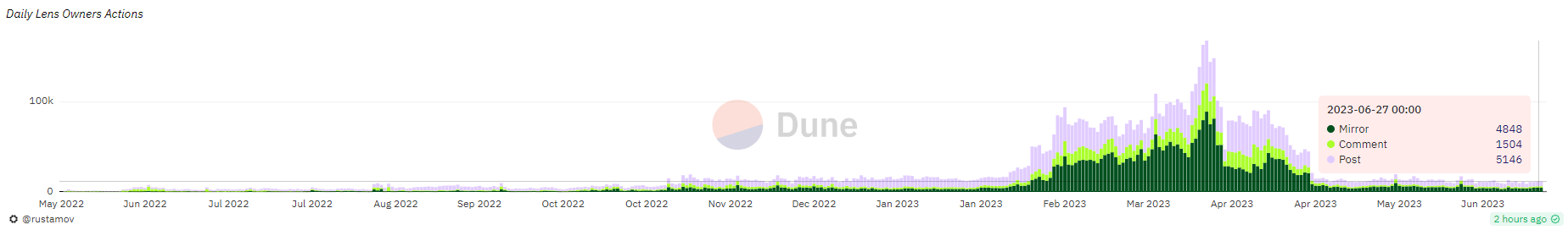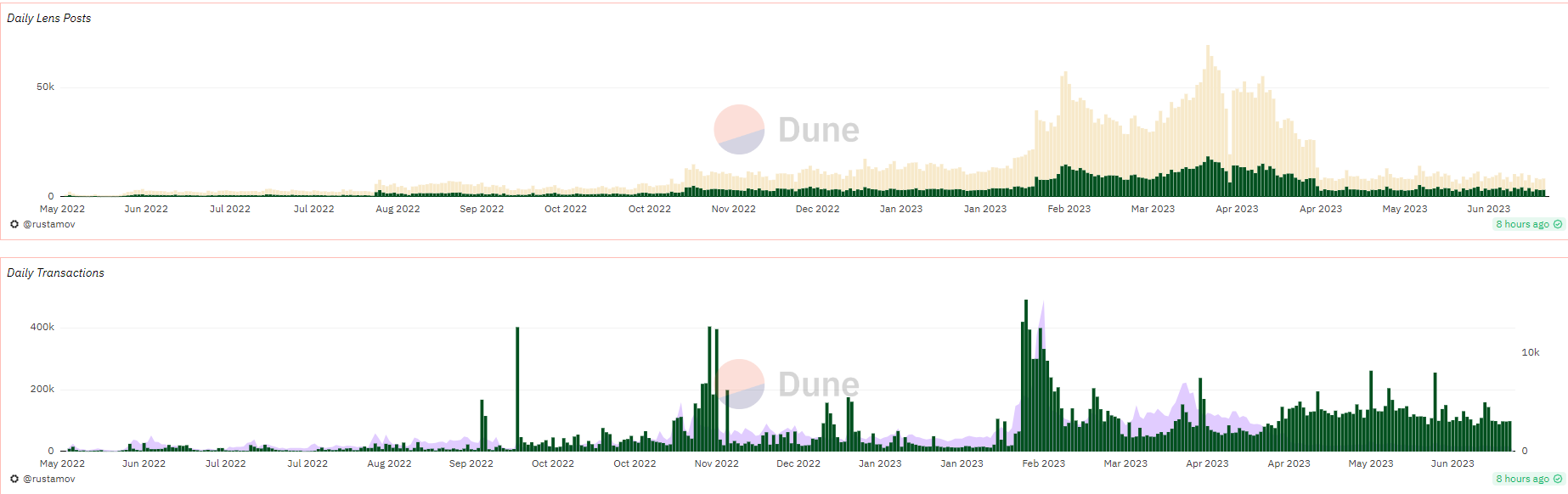 ユーザーの活発データの推移を見ると、Lens Protocolのアクティブユーザー数は常に低かったわけではなく、プラットフォームは今年の2月、3月、4月に最も活発で、日々のアクティブユーザー数は1.5万前後で、毎日投稿される投稿数も4万件前後で、毎日の取引件数は最高で40万件以上に達した。4月27日以降、日々のアクティブデータが急減し、日々のアクティブアドレス数は3K前後で推移している。これは主にLens ProtocolがProfile NFTのホワイトリスト鋳造申請を一時停止したためである。