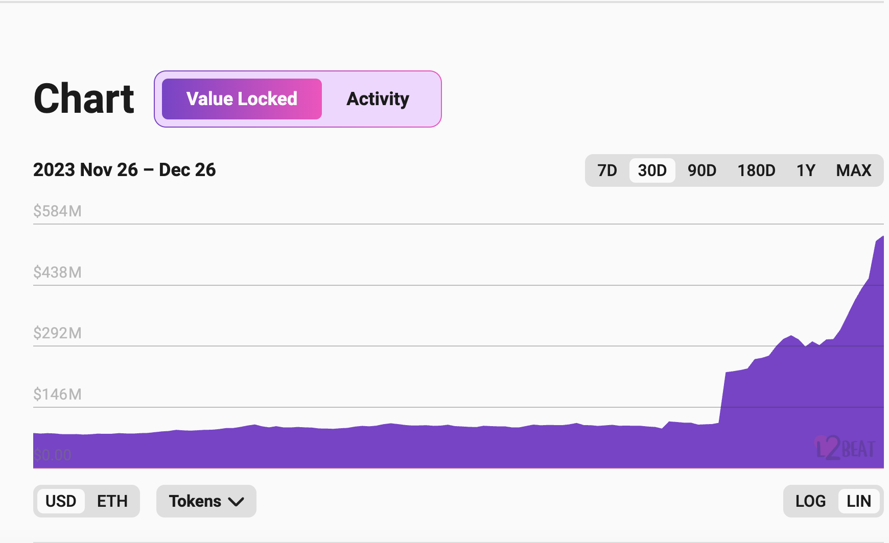 L2 Beatのデータによると、Vitalikの母Natalia Ameline、母の友人Elena Sinelnikovaが関与するこのL2プロジェクトは、現在TVLが5億ドルを超え、増加率は416%に達し、Ethereum Layer 2のトップ4にランクインしています。TVLの急上昇に伴い、コイン価格も同時に急騰し、30日で300%以上の上昇を記録しています。