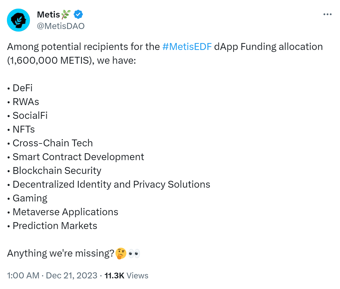 ユーザーの利を求める心理を捉えることは、流量の鍵をつかむことです。エアドロップの仕掛けはかつてL2コミュニティで最も話題にされていたトピックであり、2021年の立ち上げ時にMetisは大量のエアドロップを行いました。また、2週間後に開始される分散型POSシーケンサーのコミュニティテスト(2024年1月2日)も、積極的にテストに参加するコミュニティメンバーに豊富な報酬を提供します。