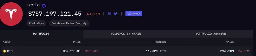 3月7日、Arkhamのデータによると、テスラのビットコイン保有量は11,509枚に達し、データが正確であれば、テスラは数年ぶりに再びビットコインを購入したことになります。
