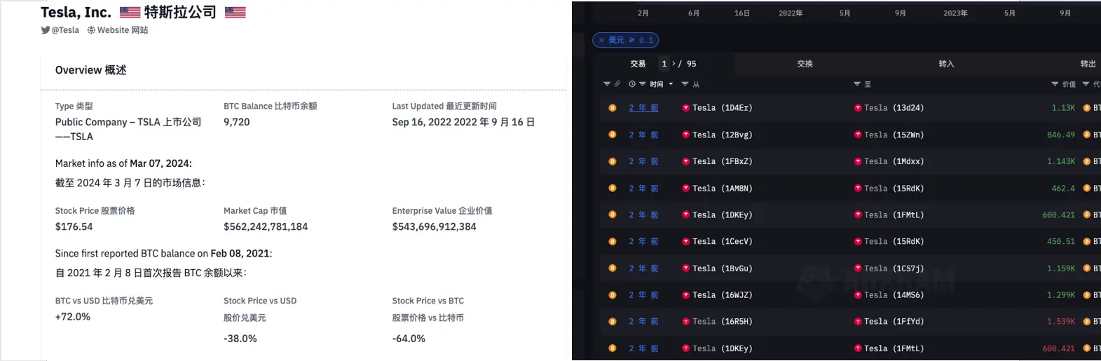 しかし、監視データによると、テスラが保有する11,509 BTCのウォレットの最後の取引記録は2年前のものです。今年1月、CoinDeskはテスラの財務報告書に基づき、ビットコインの保有量は過去3ヶ月間変化がなかったと報じました。また、テスラの公式もビットコインの追加購入数を更新しておらず、公式インターフェースには依然として9,720枚と表示されています。