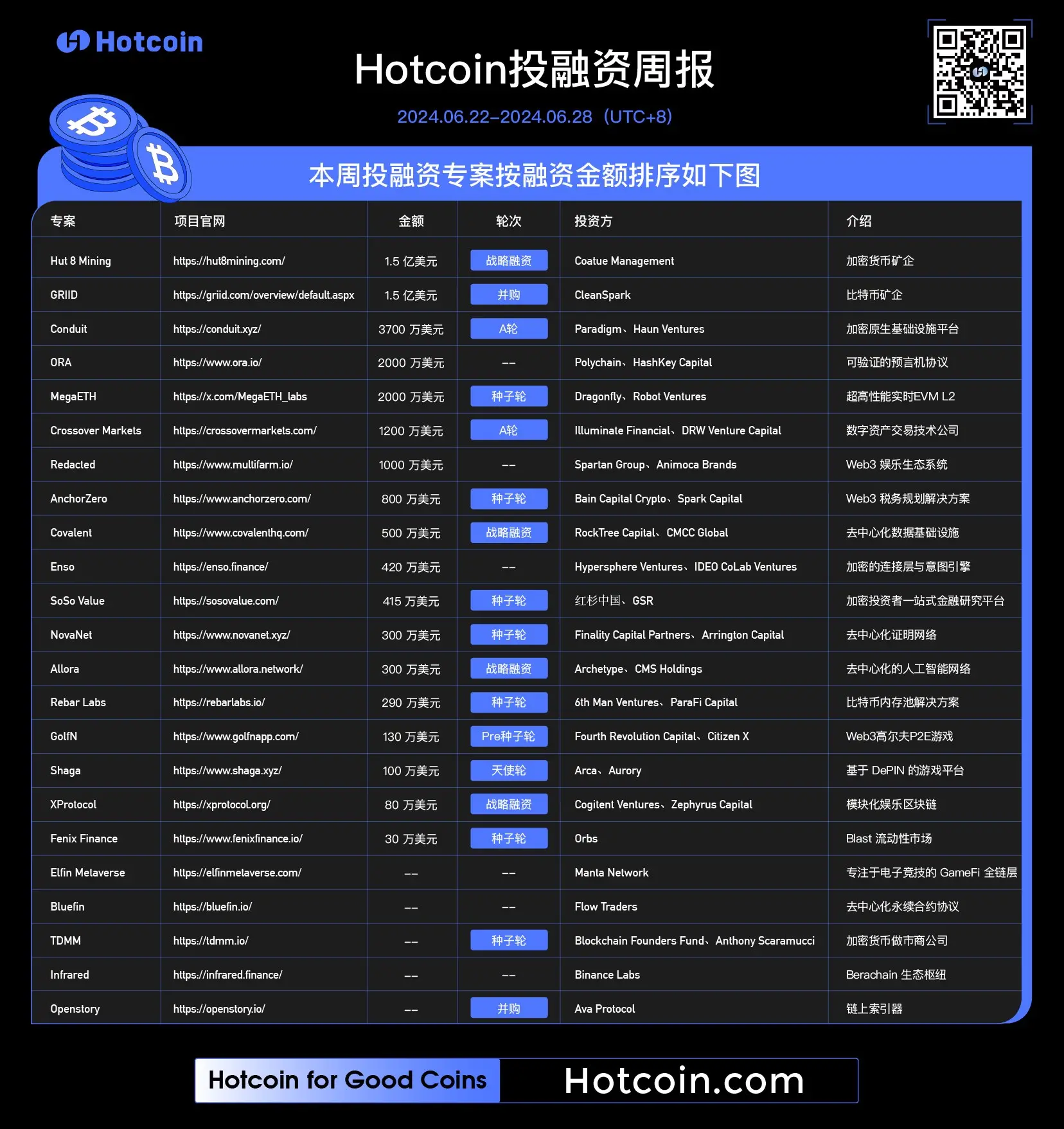 今週の暗号市場の投資・融資熱は、先週に比べて大幅に回復し、増加率は100%に達しました。暗号通貨マイニング企業Hut 8 Miningとビットコインマイニング企業GRIIDは、今週最大の融資を受け、金額は共に1.5億ドルに達しました。