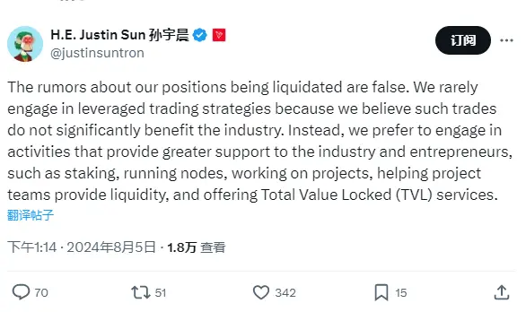 ChainCatcher のメッセージ、孫宇晨はツイッターで次のように発表しました:"私たちのポジションが清算されたという噂は事実ではありません。私たちはレバレッジ取引戦略にほとんど参加しません。なぜなら、そのような取引は業界にあまり利益をもたらさないと考えているからです。逆に、私たちは業界や起業家をより大きくサポートする活動、例えばステーキング、ノードの運営、プロジェクトの開発、流動性の供給、そして TVL の提供に従事することを好みます。"