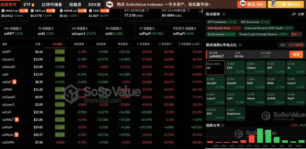 セクターの歴史的な市場動向を反映した暗号セクター指数は、ssiNFT、ssiLayer1、ssiSocialFi 指数がそれぞれ24時間で3.57%、2.90%、2.76%上昇したことを示しています。その他のセクターでは、DeFi セクターが2.72%上昇し、Layer1 セクターが1.78%上昇、Layer2 セクターが1.72%上昇、CeFi セクターが1.38%上昇しましたが、Hyperliquid(HYPE)は2日連続で調整し、24時間で3.62%下落しました。Meme セクターは1.08%上昇しました。