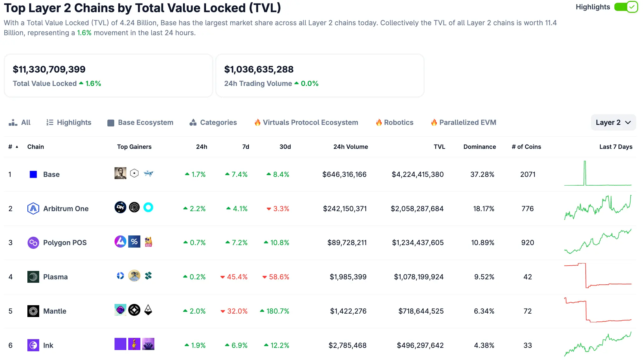 今週のBaseとArbitrumの市場シェアはそれぞれ37.28%と18.17%で、1位と2位にランクされています。