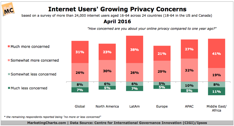 조사 기관인 Centre for International Governance Innovation과 Ipsos의 설문 조사에서 약 57%의 전 세계 소비자가 인터넷의 개인 정보 안전성에 대해 극도로(31%) 또는 매우(26%) 우려하고 있다고 밝혔다. 이 조사는 16세에서 64세 사이의 인터넷 사용자 24,000명 이상을 대상으로 하였으며, 24개 국가에 걸쳐 진행되었다. 사실, 각 지역에서 최소한 절반의 인터넷 사용자가 개인 정보에 대한 우려를 표명했다.
