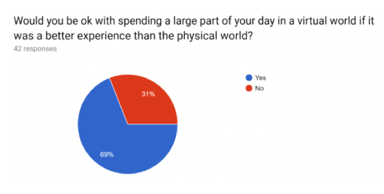 그 중 69%의 사람들이 가상 세계의 경험이 현실 세계보다 좋다면 가상 세계에서 현실 세계보다 더 많은 시간을 보낼 의향이 있다고 응답했다.
