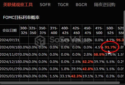 거시 경제 측면에서 현재 가장 큰 기대는 연준의 금리 인하입니다. 금리 인하는 시장에 새로운 유동성을 가져온다는 의미입니다. 현재 많은 분석가들이 9월에 25bp 금리 인하에 대해 큰 기대를 걸고 있으며, 연준 관찰 도구에 따르면 9월 금리 인하 가능성은 91.7%로 상승했습니다. 아래 그림과 같습니다.