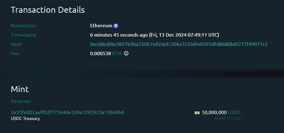 ChainCatcher 메시지에 따르면, Whale Alert가 모니터링한 결과, USDC Treasury가 베이징 시간 15:49에 이더리움 체인에서 50,000,000 USDC를 추가 발행했습니다.