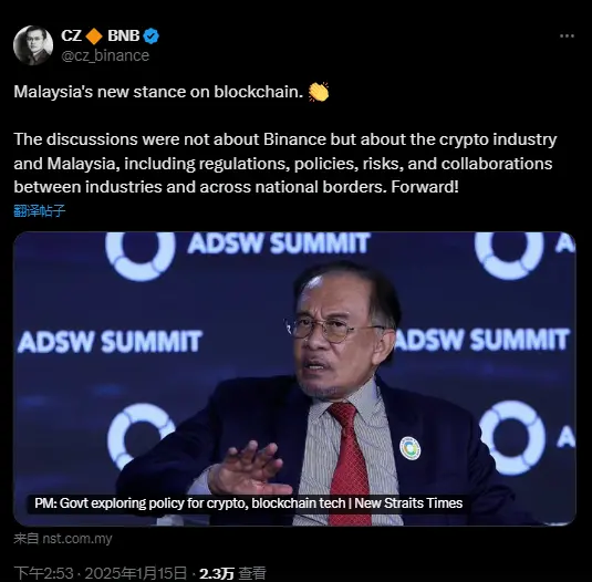 ChainCatcher 메시지에 따르면, 《신해협시보》는 말레이시아 총리 안와르 이브라힘이 정부가 암호화폐와 블록체인 기술을 인정하기 위한 디지털 금융 정책을 연구하고 있다고 밝혔다고 보도했습니다. 그는 아부다비 지속 가능한 발전 주간 동안 아부다비 정부 및 바이낸스(Binance) 창립자 자오창펑과 논의하며 이 분야의 발전을 어떻게 촉진할 수 있을지 탐구했습니다.