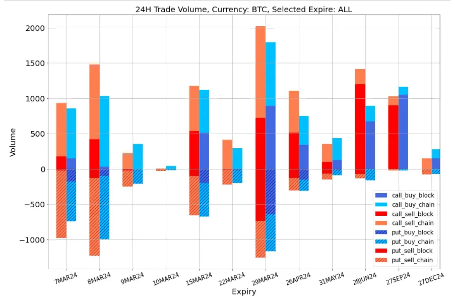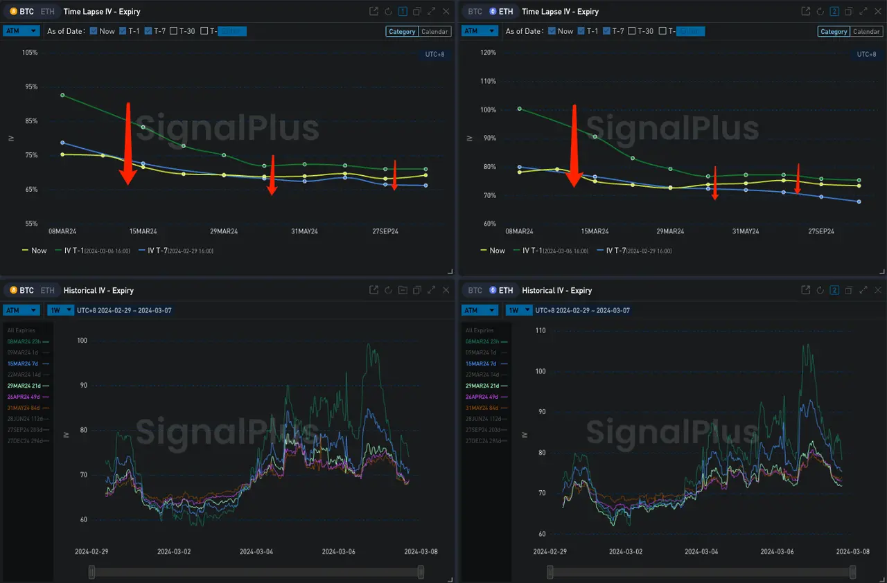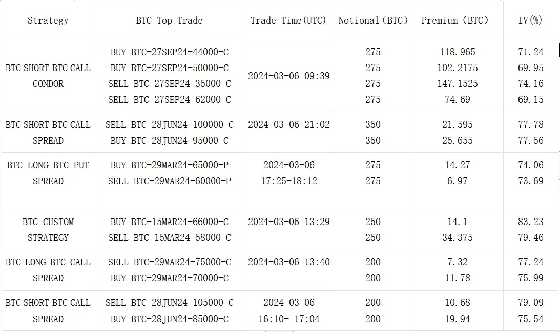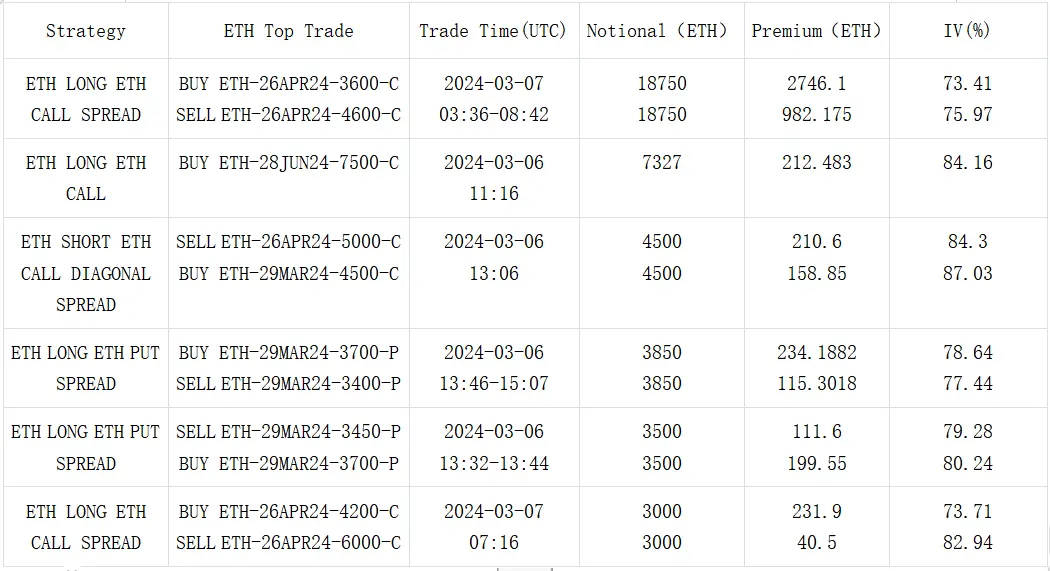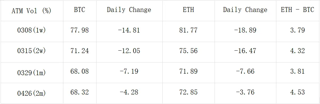 數字貨幣方面,價格在經歷昨日的 V 字形大幅震盪行情後暫時獲得平靜,BTC 和 ETH 日內分別圍繞 66000/3800 附近小幅震盪,期權市場的累積的緊張情緒被快速釋放,使得短期波動率下跌超過 12% Vol, 7 D ATM IV 指標跌穿至 7 D RV 以下。從成交上看,每當市場進入這樣的"冷靜期"時,成交分布都有向中遠期發生轉移的傾向,今天也不例外,ETH 26 APR 成交了一組單筆 18750 ETH 的 3600 vs 4600 Long Call Spread,成為市場焦點,BTC 三月底往後的期限則有許多 Sell Call Spread 成交。除此之外,昨日的暴跌可能打得不少人猝不及防,今日 IV 的回落吸引了集中在三月底的 Put Spread 建倉(例如 BTC 65000 vs 60000),能為近期多頭持倉提供一定的保護。