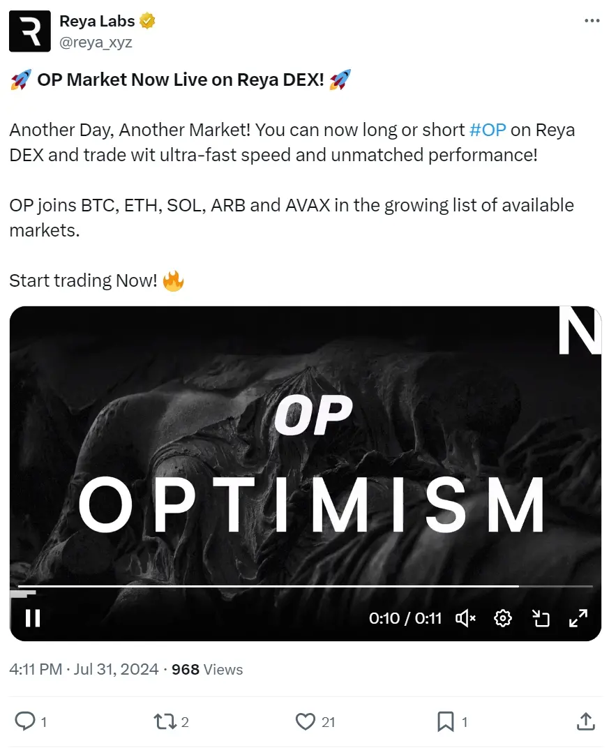 ZEC $307.86 +9.08%ChainCatcher 消息,Reya Labs 于 X 發文表示,OP 市場已上線 Reya DEX。