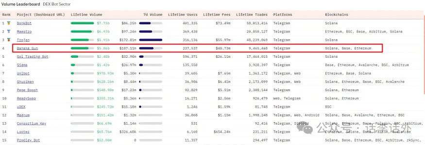 我們僅從近 7 天的交易量來看,目前 Banana Gun 的交易量為 1 億左右,占到了 18.5%,如下圖所示。