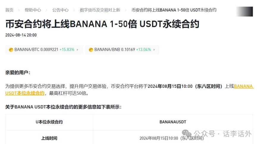前幾天(8月15日)我看到 Binance 公告說上線了 BANANA 的永續合約,槓桿最高可達 50 倍。如下圖所示。
