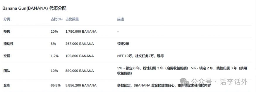 Banana Gun 的原生代幣是 BANANA,是一種通縮型代幣,最大供應量僅為 1000 萬。目前的總供應量約為 8,900,000,循環供應量為 3,220,000 (約占代幣總供應量的 32%)。具體分配如下圖所示。